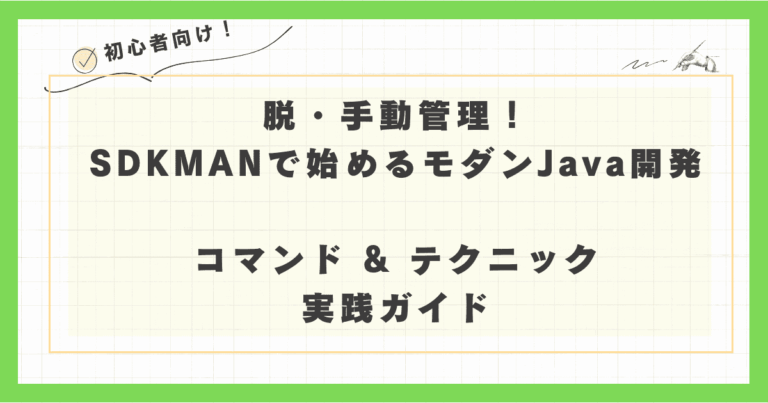 Java開発環境をモダンに管理するSDKMANコマンドの全体像 「コマンドラインツールはちょっと苦手で…」と感じる方もいるかもしれません。 しかし、ご安心ください!SDKMANのコマンドは非常に直感的で、一度覚えてしまえ … 続きを読む 脱・手動管理! SDKMAN で始めるモダン Java 開発: SDKMAN コマンド & テクニック 実践ガイド