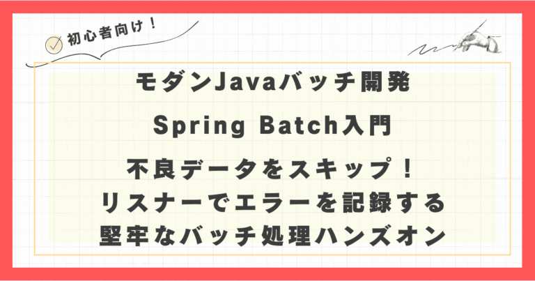 なぜSpring Batchのスキップとリスナーが必要なのか? バッチ処理を運用していると、「CSVファイルに不正なデータが混じっていて処理が止まってしまった…」「一部のデータのエラーで、せっかくのバッチ処理が完走できな … 続きを読む モダンJavaバッチ開発:不良データをスキップ!リスナーでエラーを記録する堅牢なバッチ処理ハンズオン